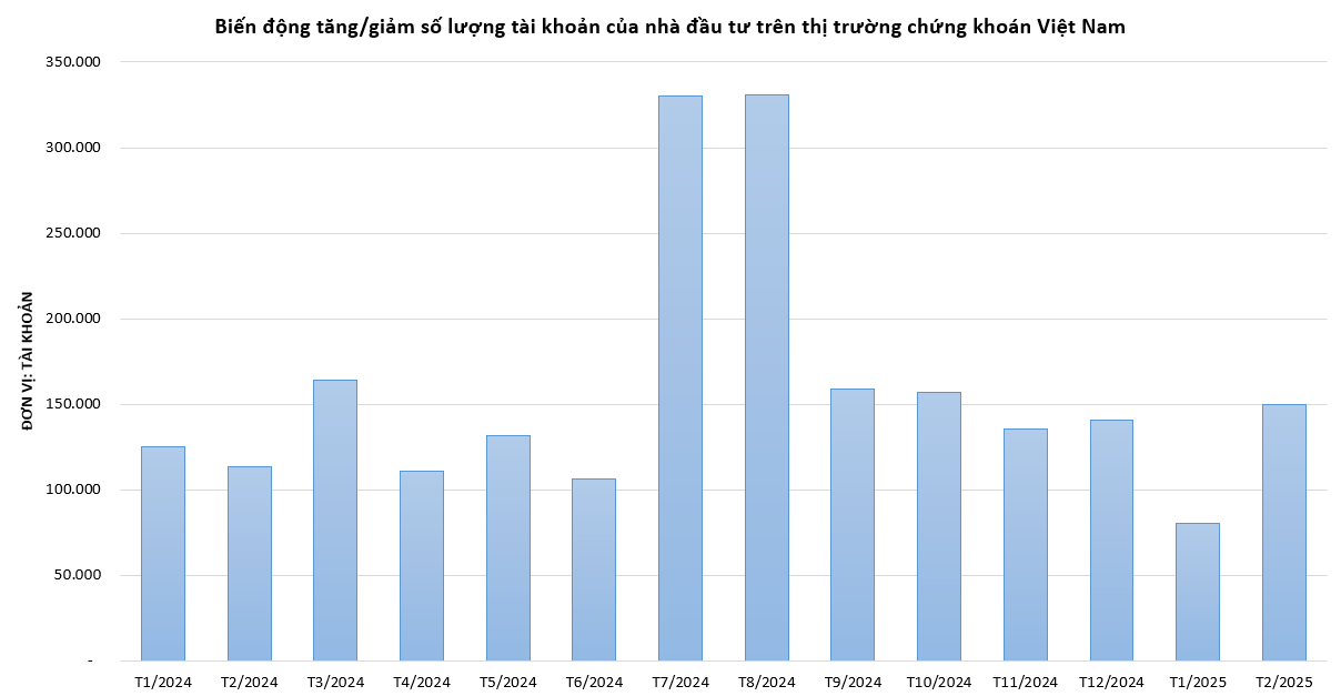 Theo số liệu từ Trung tâm Lưu ký Chứng khoán Việt Nam (VSDC), trong tháng 2/2025, nhà đầu tư trong nước đã mở mới 149.863 tài khoản.