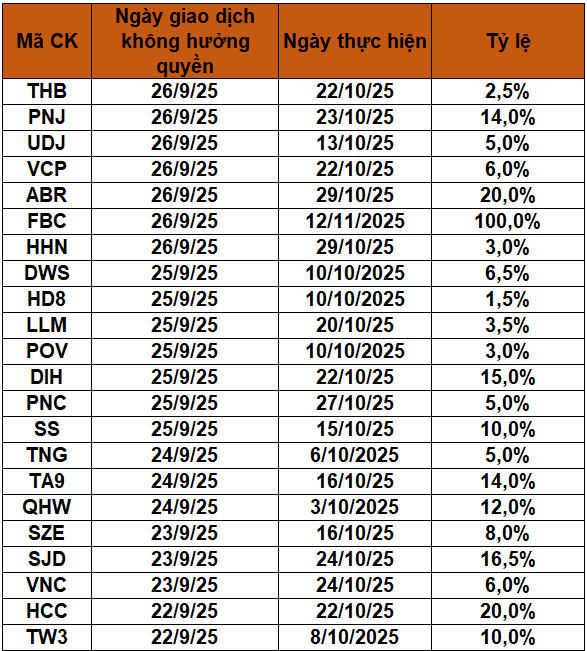 Theo thống kê, có 27 doanh nghiệp thông báo chốt quyền cổ tức trong tuần 22/9– 26/9. Trong đó, 22 doanh nghiệp trả cổ tức bằng tiền mặt trong tuần này, mức cao nhất là 100% và thấp nhất là 1,5%,.
