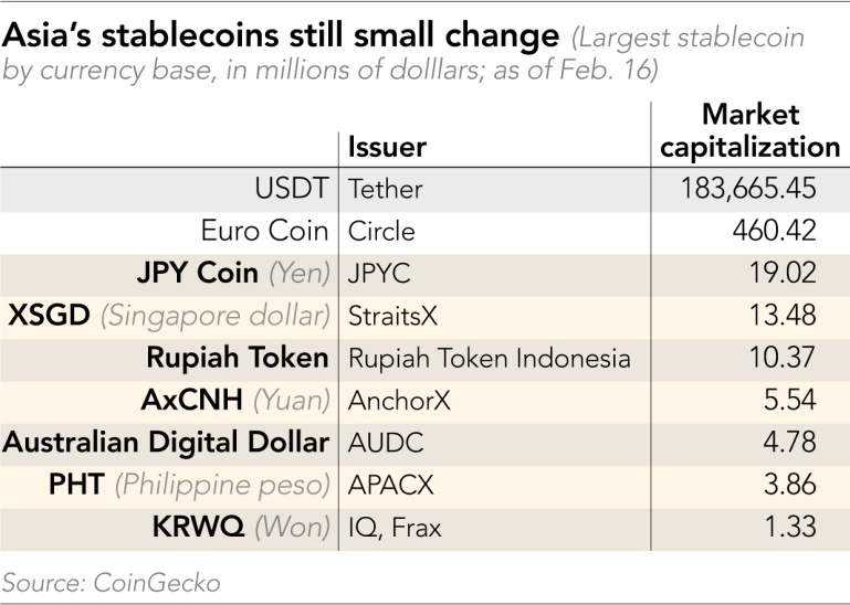 Vốn hóa của các đồng stablecoin châu Á thấp hơn đáng kể so với USDT hay USDC (Nguồn: NIkkei Asia)