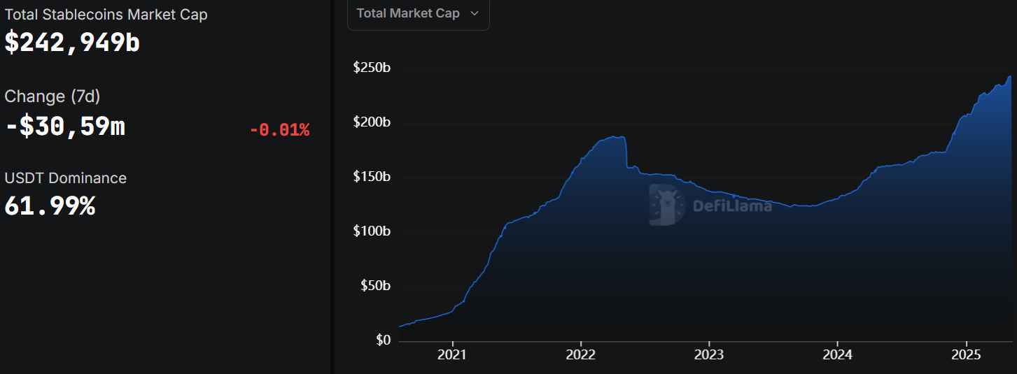 Thị trường stablecoin vừa ghi nhận cú trượt nhẹ khi vốn hóa giảm 36,95 triệu USD, tương đương 0,02% trong tuần qua, còn khoảng 242,94 tỷ USD, theo defillama.com. Dù mức giảm không đáng kể, nhưng rõ ràng là cuộc đua trong mảng tiền số vẫn còn khốc liệt.