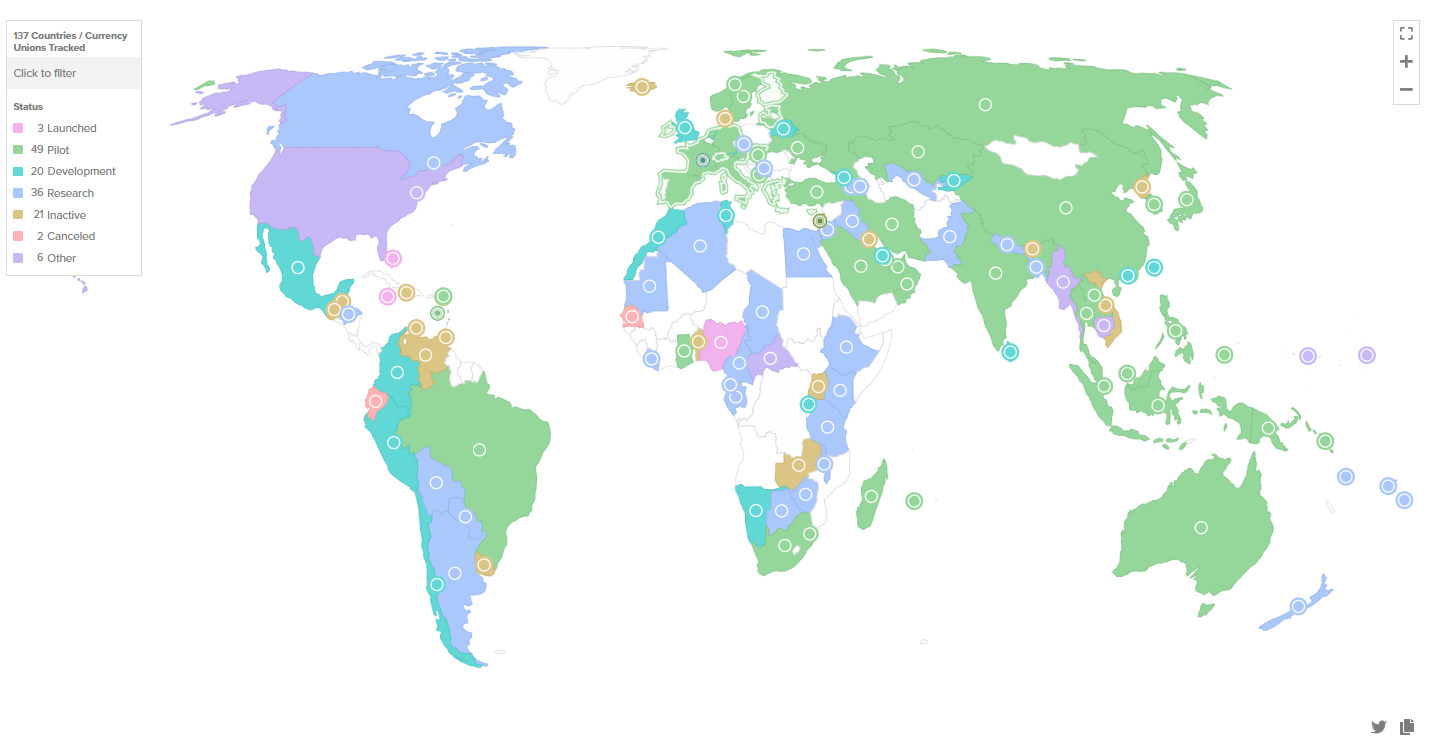 3 quốc gia đã chính thức phát hành CBDC, 105 quốc gia khác đang ở các giai đoạn nghiên cứu, phát triển hoặc thử nghiệm thí điểm (pilot) (Nguồn: Nguồn: Hội đồng Đại Tây Dương)