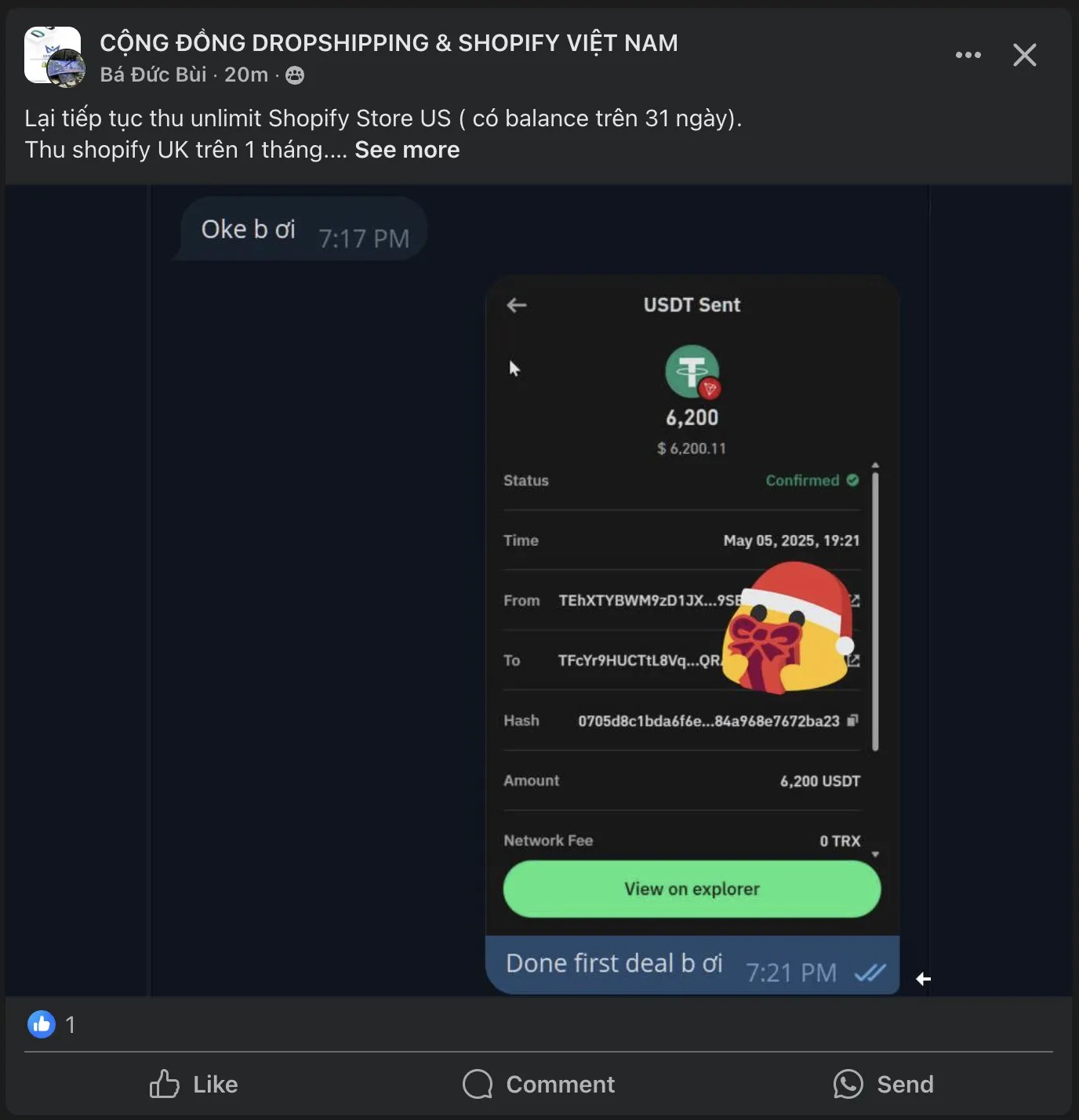 Ví dụ về thanh toán P2P qua USDT, từ nhóm người dùng Shopify Việt Nam (Nguồn: Facebook)