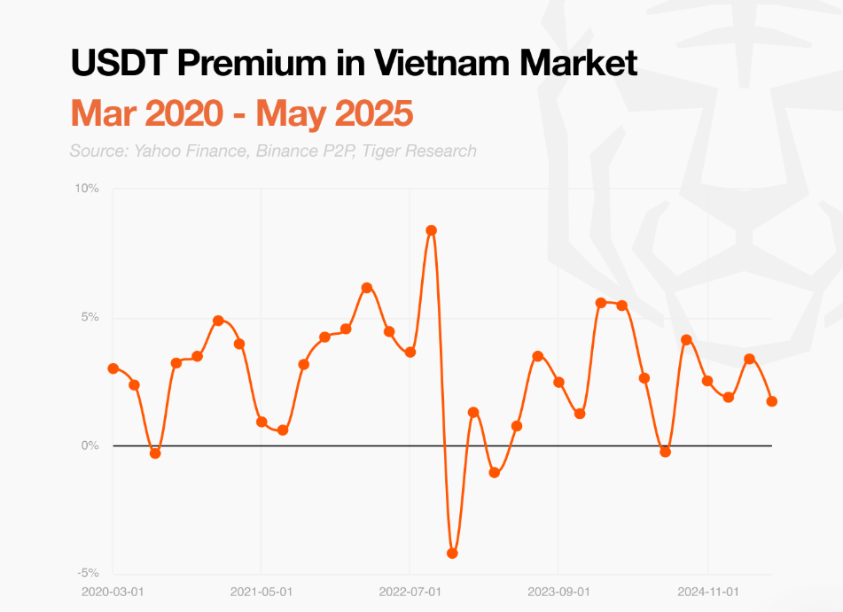 Theo Tiger Research, hiện tượng này thể hiện xu hướng nhất quán. Từ năm 2020 đến 2025 (ngoại trừ các cú sập lớn như FTX hay Terra-Luna), USDT tại Việt Nam luôn duy trì mức chênh lệch cao hơn tỷ giá chính thức.