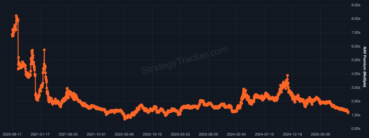 Giá trị tài sản ròng (mNAV) của Strategy đã giảm xuống mức thấp nhất kể từ đầu năm 2023 (Nguồn: StrategyTracker)