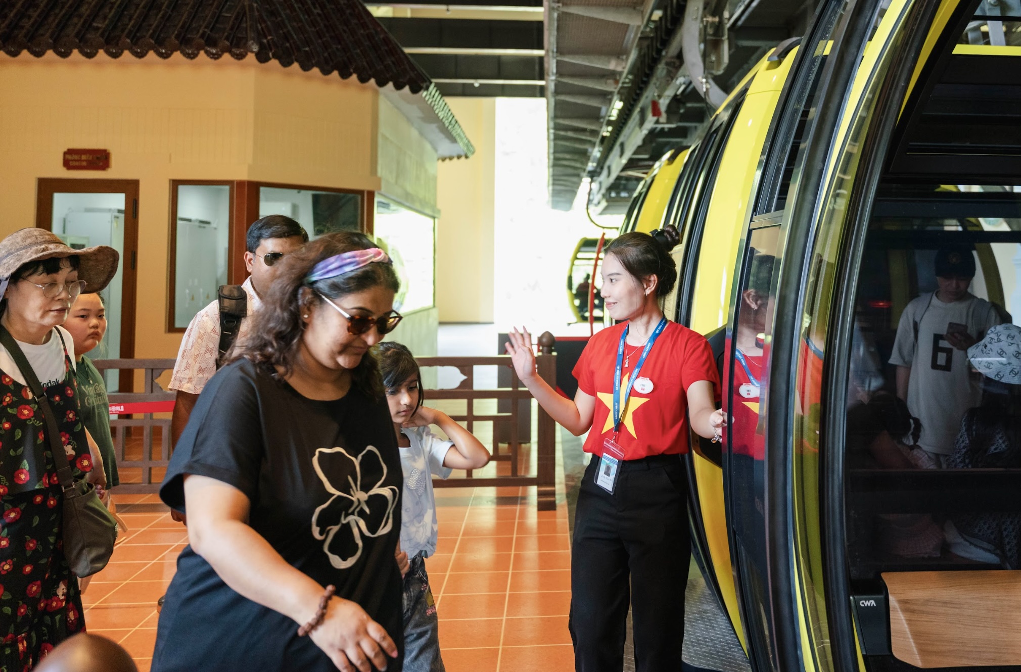 Đặc biệt, không gian nhà ga cũng gây ấn tượng bởi sự kết hợp hài hòa giữa nét truyền thống và hơi thở hiện đại. Chất liệu gỗ ấm áp được sử dụng cho các cột trụ, khung cửa lớn và vách ngăn, gợi nhớ đến kiến trúc đình làng Việt Nam – trung tâm của các hoạt động văn hóa, lễ hội xưa. Những họa tiết dân gian, đặc biệt là hình ảnh từ tranh khắc gỗ, được biến tấu tinh tế trên các mảng kính và gạch lát sàn.