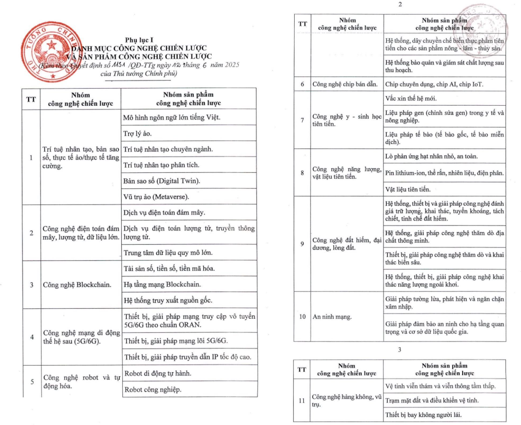 Theo quyết định, 11 nhóm công nghệ chiến lược, bao gồm trí tuệ nhân tạo, điện toán đám mây, blockchain, công nghệ di động 5G/6G, robot và tự động hóa, chip bán dẫn, công nghệ y sinh tiên tiến, năng lượng, vật liệu, đất hiếm, an ninh mạng, và công nghệ hàng không vũ trụ.