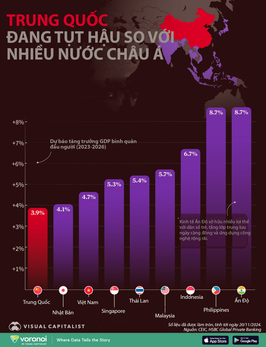 Trung Quốc được dự báo đạt tốc độ trăng trưởng GDP bình quân đầu người chỉ khoảng 3,9% trong giai đoạn 2023-2026, thấp hơn so với 4,1% của Nhật Bản và 4,7% của Việt Nam.