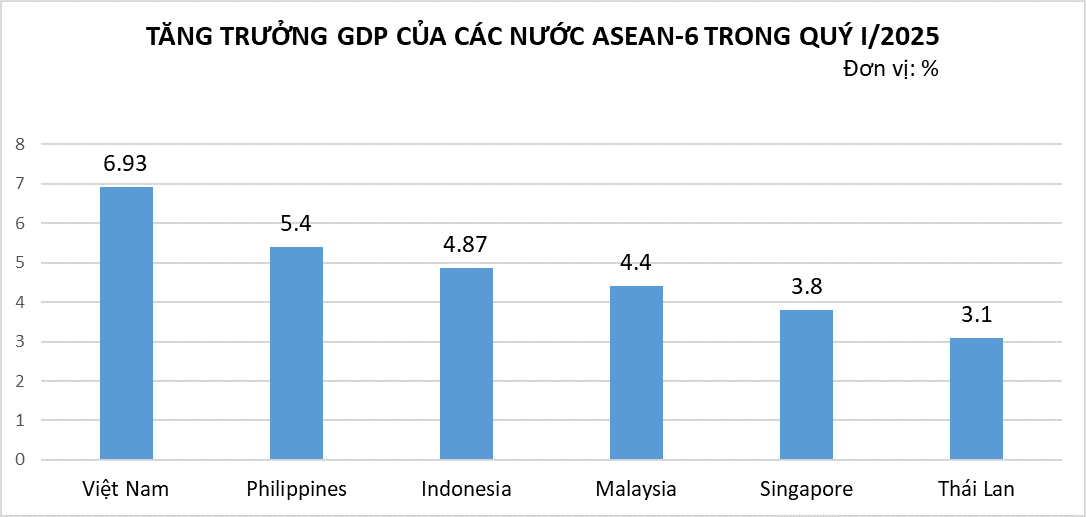 Theo số liệu thống kê, trong quý I, Việt Nam là quốc gia có tăng trưởng kinh tế (GDP) cao nhất khu vực ASEAN-6 (bao gồm Việt Nam, Malaysia, Singapore, Indonesia, Philippines và Thái Lan) với mức tăng 6,93%.