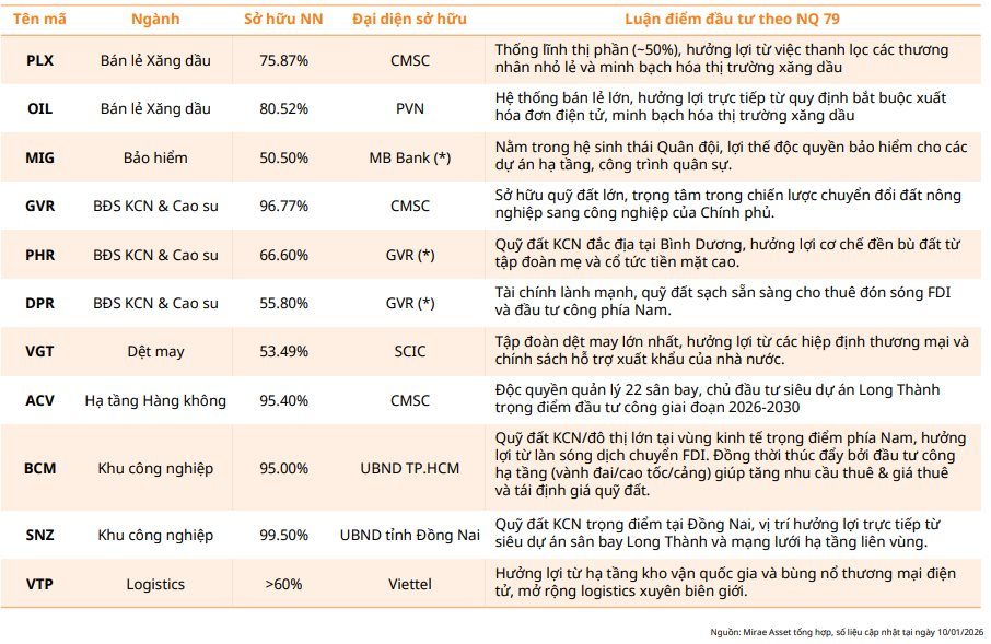 Loạt doanh nghiệp hưởng lợi trực tiếp từ Nghị quyết 79 (Nguồn: Mirae Asset)