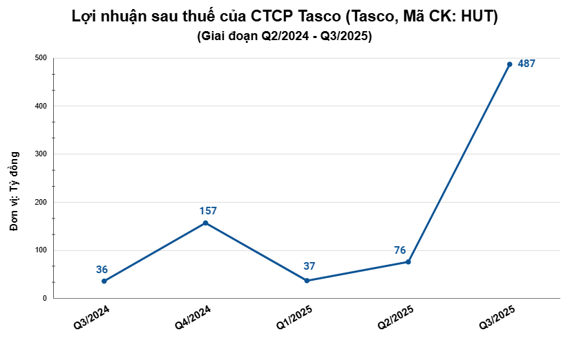 CTCP Tasco (Tasco, Mã CK: HUT) công bố kết quả kinh doanh quý 3/2025 với khoản lãi sau thuế đạt 486,9 tỷ đồng, cao gấp 13,5 lần so với cùng kỳ năm trước.
