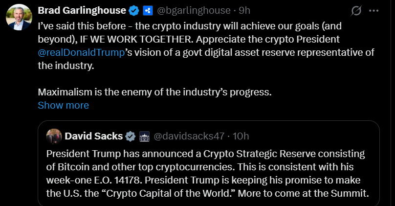 Bài đăng của CEO Ripple sau khi ông Trump lựa chọn thêm XRP vào kho dự trữ crypto