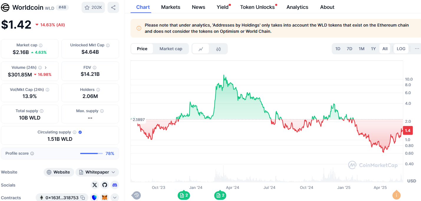 Diễn biến giá của token $WLD (Nguồn: CoinMarketCap)