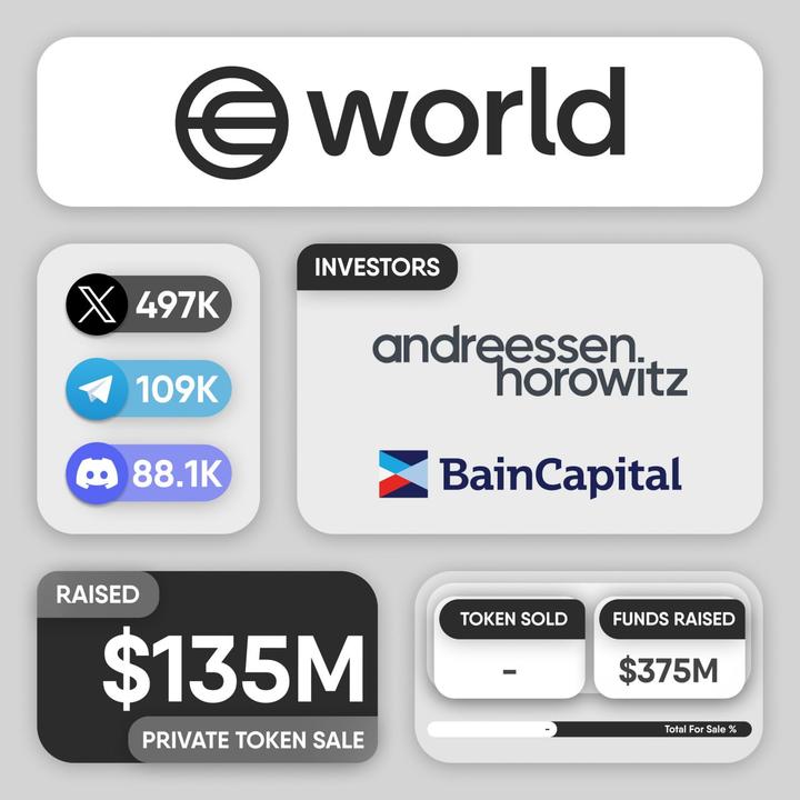 Dự án đã huy động tổng cộng hơn 250 triệu USD từ các quỹ đầu tư lớn như Andreessen Horowitz (a16z), Khosla Ventures, Bain Capital Crypto, và các nhà đầu tư cá nhân như Reid Hoffman và Sam Bankman-Fried (trước khi FTX sụp đổ). Gần đây nhất, World Foundation huy động thêm 135 triệu USD thông qua bán token cho a16z và Bain Capital Crypto. Tổng cộng, dự án đang có 385 triệu USD vốn huy động.