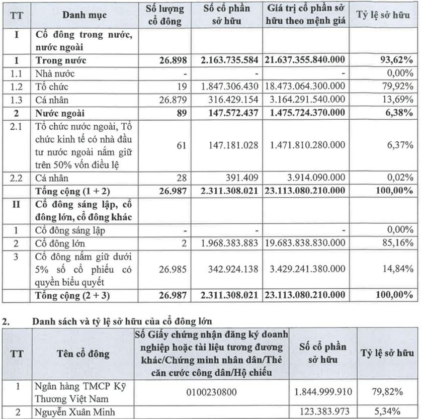 Hiện, Techcombank vẫn giữ vai trò ngân hàng mẹ của TCBS với tỷ lệ sở hữu 79,82%. Ngoài ra, TCBS còn một cổ đông lớn khác là ông Nguyễn Xuân Minh – Chủ tịch HĐQT – đứng tên sở hữu 123,3 triệu cổ phiếu, chiếm tỷ lệ 5,34% vốn.