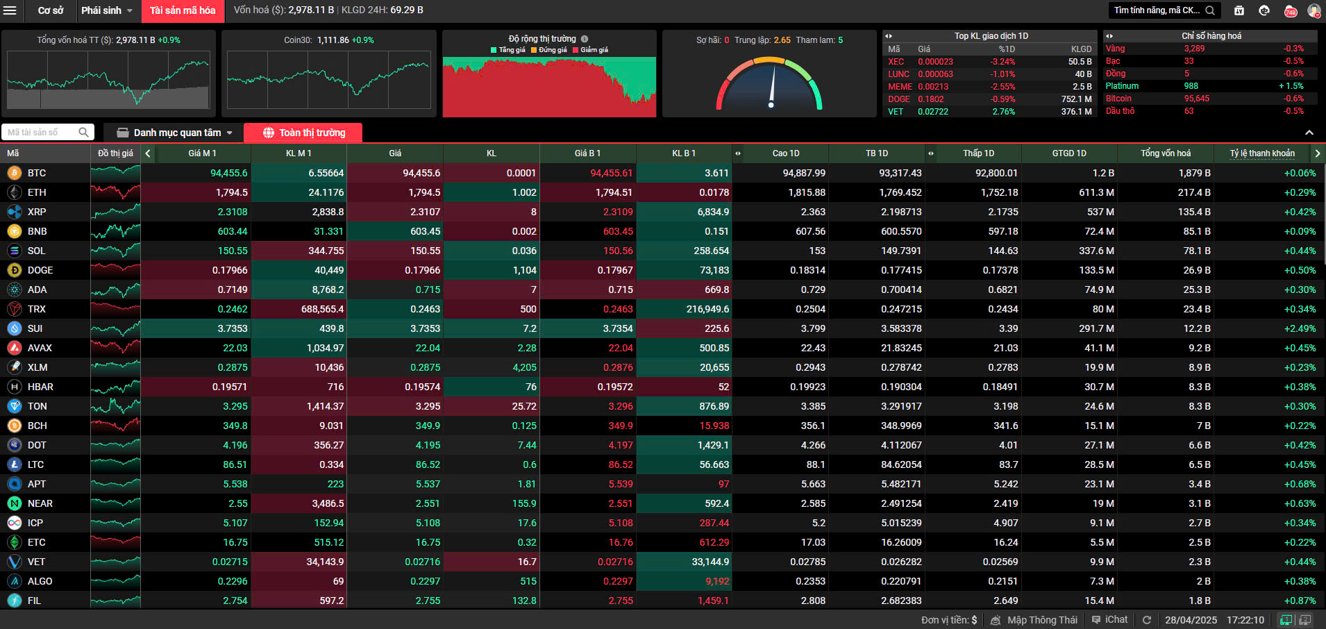 Bảng giá tài sản mã hóa của TCBS hiện hiển thị 100 đồng tiền mã hóa phổ biến như BTC (Bitcoin), ETH (Ethereum), XRP, BNB, DOGE… Bảng giá có chức năng theo dõi các chỉ số như giá giao dịch, khối lượng mua bán, tổng vốn hóa và tỷ lệ thanh khoản.