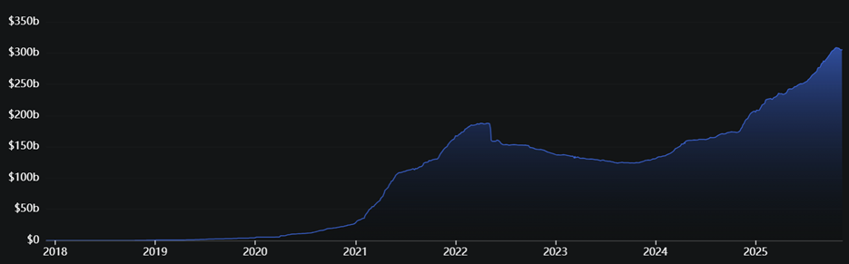 Tổng giá trị thị trường stablecoin hiện được định giá hơn 300 tỷ USD, vơi USDT chiếm khoảng 60% thị phần (Nguồn: DefiLlama)