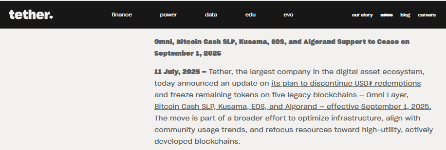 Tether thông báo sẽ dừng quy đổi USDT trên 5 blockchain, gồm: Omni Layer, Bitcoin Cash SLP, Kusama, EOS (hiện là Vaulta) và Algorand, từ ngày ngày 1/9.