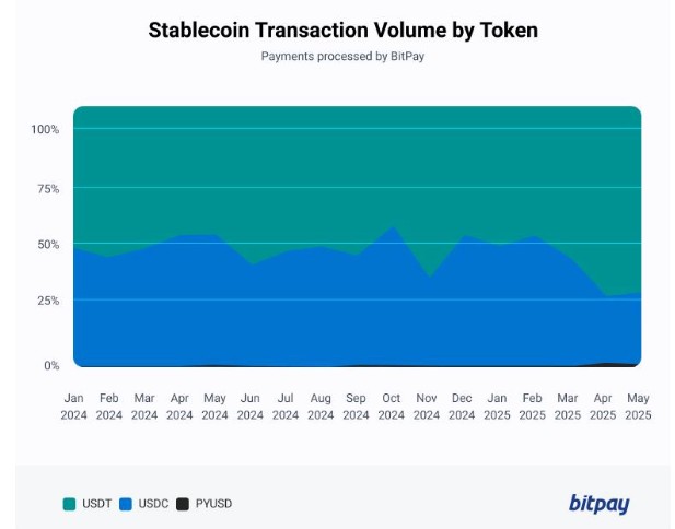 Tính đến tháng 5/2025, thị phần giao dịch của USDC trên BitPay đã tụt xuống 56%, trong khi USDT tăng vọt lên 43%, bất chấp lợi thế về pháp lý của USDC tại châu Âu theo khung MiCA và đợt IPO đình đám của Circle đầu hồi tháng 6.
