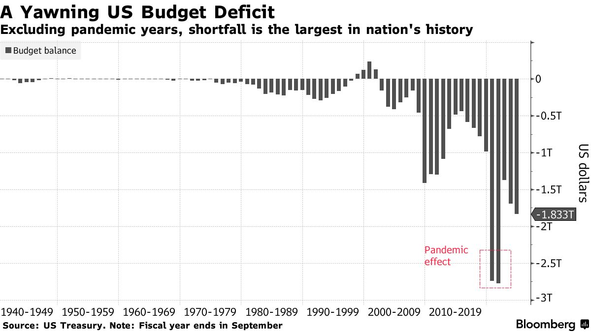 Dữ liệu của Bộ Tài chính Mỹ công bố ngày 18/10 cho thấy, thâm hụt trong năm tài khóa kết thúc vào ngày 30/9 là 1,83 nghìn tỷ USD, tăng so với mức 1,7 nghìn tỷ USD của năm trước. Đây là mức tăng lớn nhất được ghi nhận nếu loại trừ các năm tài khóa 2020 và 2021.