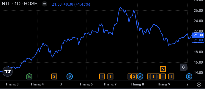Trên thị trường chứng khoán, sau khi tạo mức đỉnh lịch sử ở phiên 12/7 với mức giá 26.610 đồng/cp, cổ phiếu NTL đang có những nhịp điều chỉnh khá mạnh. Kết phiên 8/10, NTL đóng cửa ở mức 21.300 đồng/cp, giảm tới gần 20% so với mức đỉnh được thiết lập hồi tháng 7 vừa qua.