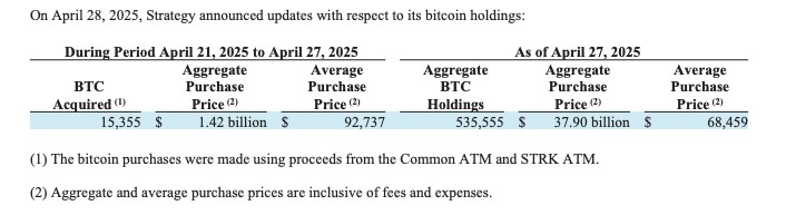 Strategy tiếp tục chiến lược DCA Bitcoin khi mua thêm 15.355 Bitcoin trong khoảng thời gian từ 21 - 27/4, với mức giá trung bình 92.737 USD/BTC. Đây là thương vụ lớn nhất của công ty kể từ cuối tháng 3, khi họ chi 1,92 tỷ USD để mua 22.048 BTC.