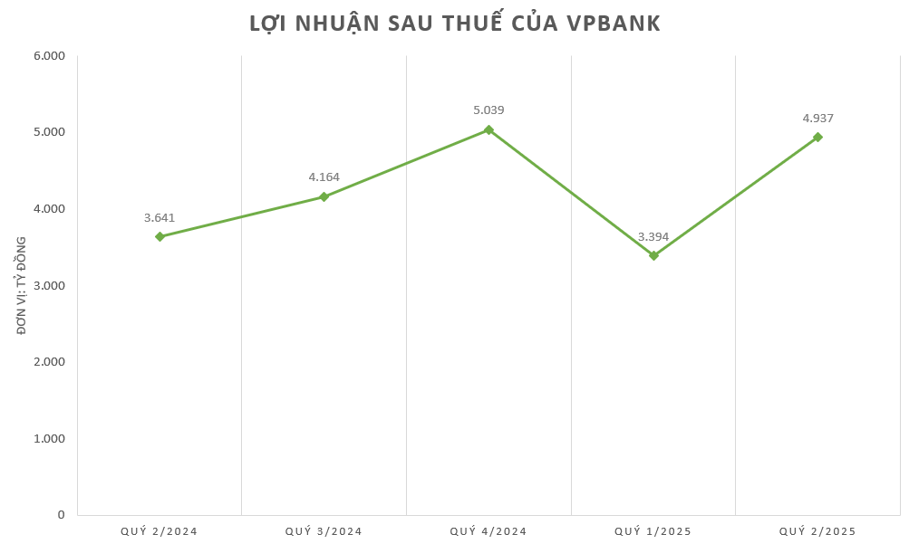 Kết quả, VPBank ghi nhận lợi nhuận trước thuế đạt mức 6.214,5 tỷ đồng, tăng 38,3% so với quý 2/2024. Khấu trừ chi phí, ngân hàng của Chủ tịch Ngô Chí Dũng báo lãi ròng 4.937,4 tỷ đồng, tăng 35,5% và là mức lãi theo quý cao thứ hai trong lịch sử hoạt động.