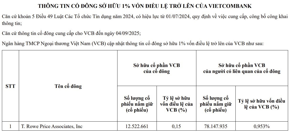 Theo thông tin công bố của Vietcombank, căn cứ dữ liệu cổ đông cập nhật đến ngày 4/9/2025, quỹ ngoại T. Rowe Price Associates, Inc. hiện đang sở hữu hơn 12,5 triệu cổ phiếu VCB, tương đương 0,15% vốn điều lệ. Ngoài ra, người có liên quan đến cổ đông này cũng đang nắm giữ thêm 78,1 triệu cổ phiếu, tương đương 0,953% vốn.