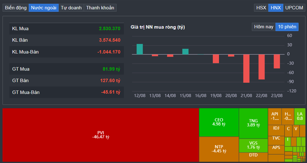 Trên HNX, khối ngoại bán ròng 45,6 tỷ đồng.