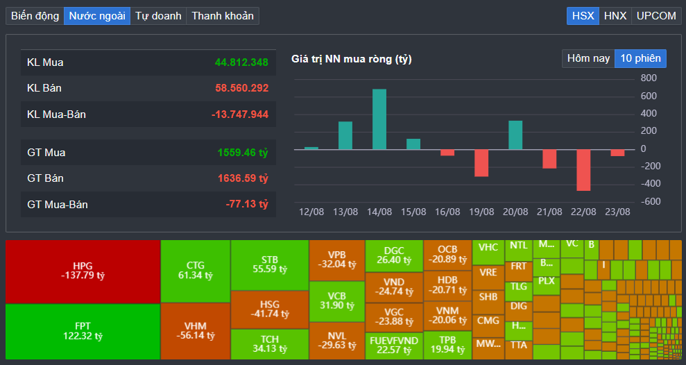 Ngược lại, "ông lớn" công nghệ FPT được khối ngoại mua ròng phiên thứ 4 liên tiếp với giá trị 122,3 tỷ đồng. Bên cạnh đó, CTG được khối ngoại “gom” ròng 61,3 tỷ đồng. Các các mã như STB, TCH, VCB, DGC,... cũng được khối ngoại mua ròng trong phiên 23/08.