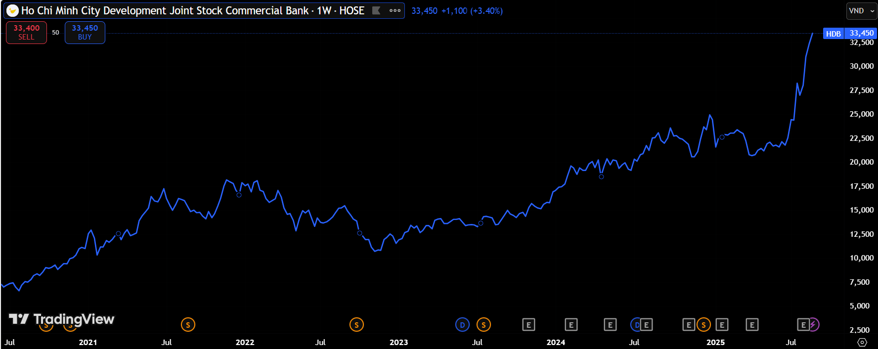 HDB lập đỉnh mới 33.450 đồng/cp tại phiên 29/8 (Nguồn: TradingView)