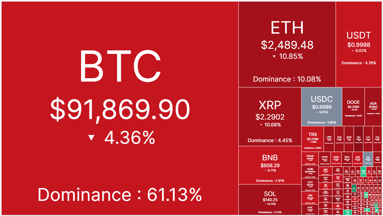 - Altcoin còn rớt giá còn thê thảm với với ETH sụt 10% về 2.460 USD, SOL giảm 15% về 138 USD, còn các đồng big cap khác có chung mức điều chỉnh từ 10-20%.