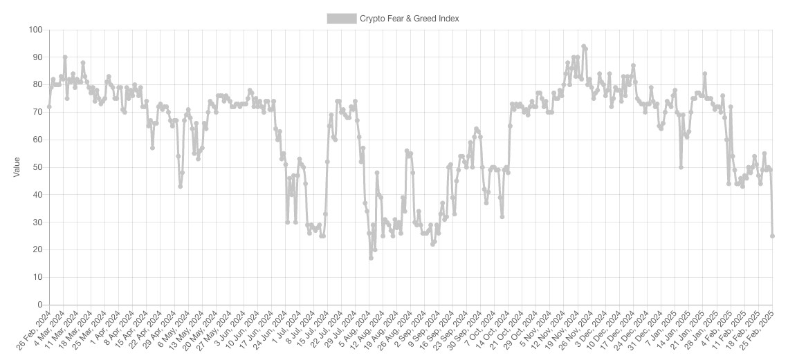 - Ngày 25/2, Crypto Fear & Greed Index (chỉ số đo lường biến động tâm lý thị trường) tụt 24 điểm, xuống mức 25 - “extreme fear” (cực kỳ sợ hãi).