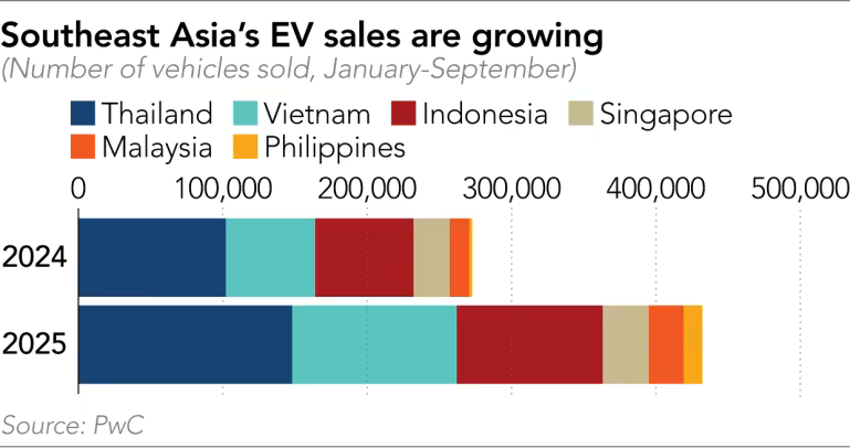 Ở quy mô khu vực, doanh số xe điện trong ba quý đầu năm tăng 62% so với cùng kỳ. Trong nhóm ASEAN-6 (gồm: Indonesia, Malaysia, Philippines, Singapore, Thái Lan và Việt Nam), Malaysia và Philippines đang xếp cuối về tăng trưởng xe điện.