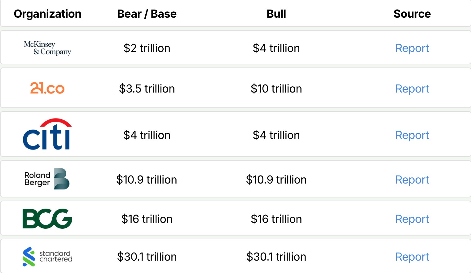 Trong khi đó, các tổ chức như Standard Chartered và lãnh đạo mạng lưới blockchain Polygon lại kỳ vọng con số này sẽ chạm mốc 30.000 tỷ USD trong thập kỷ tới.