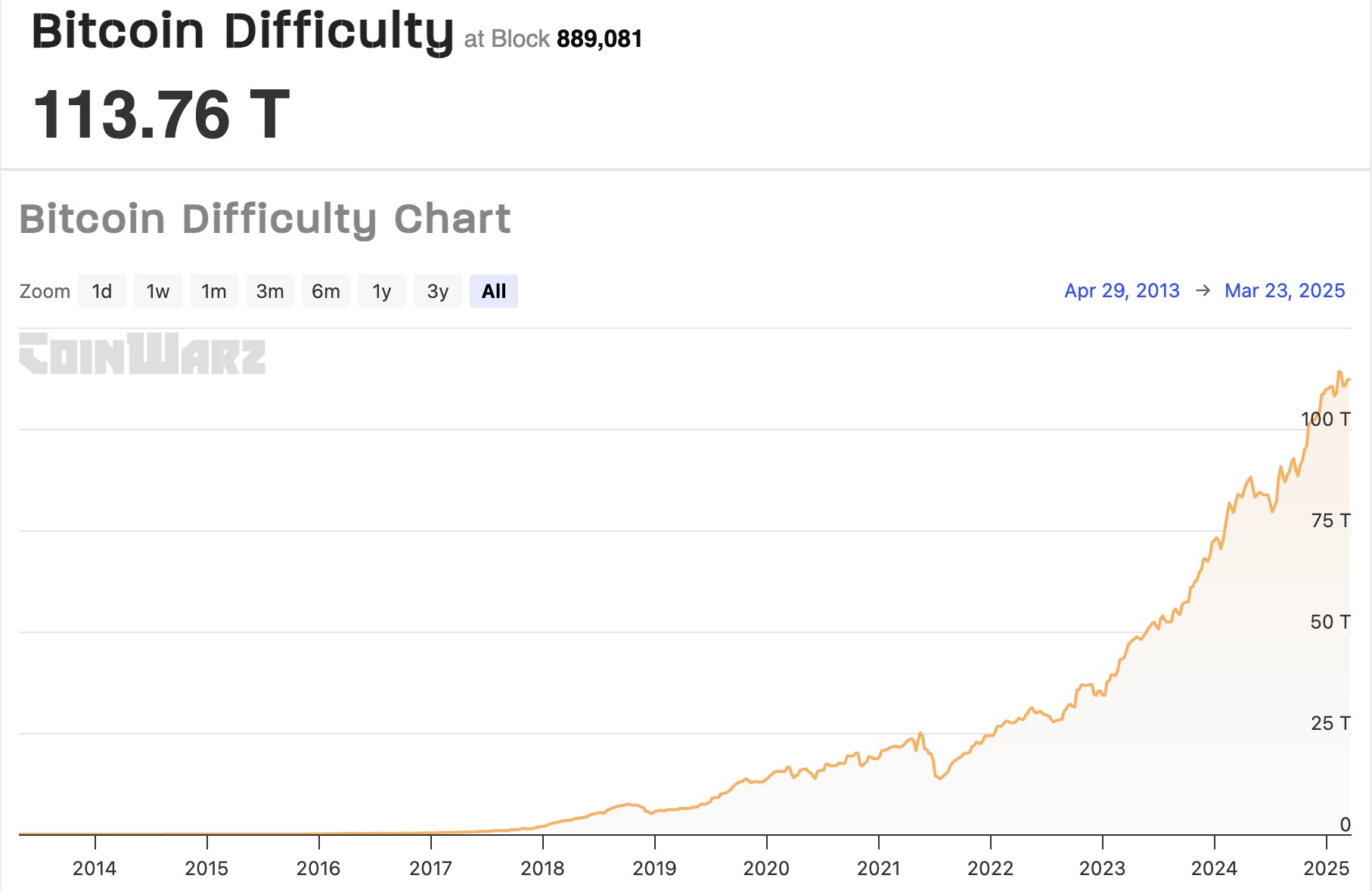 Số liệu từ CoinWarz cho thấy độ khó khai thác Bitcoin đã tăng lên 113,76 nghìn tỷ tại block 889.081 (ngày 23/3).