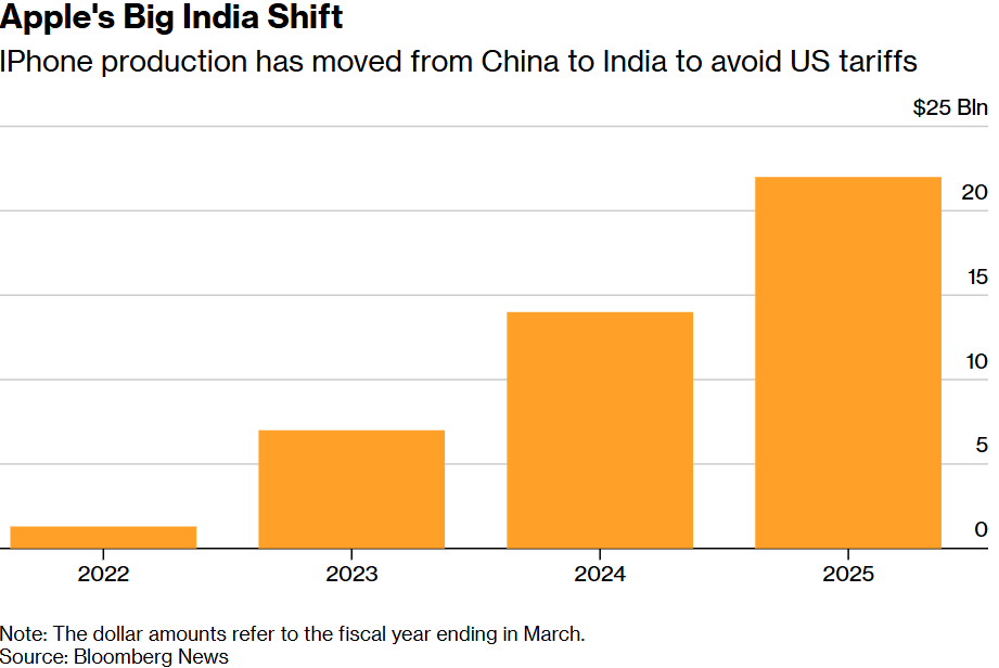 Apple đang đẩy nhanh chiến lược dịch chuyển chuỗi cung ứng khỏi Trung Quốc. Năm 2025, khoảng 1/4 số iPhone trên toàn cầu đã được lắp ráp tại Ấn Độ, theo Bloomberg.