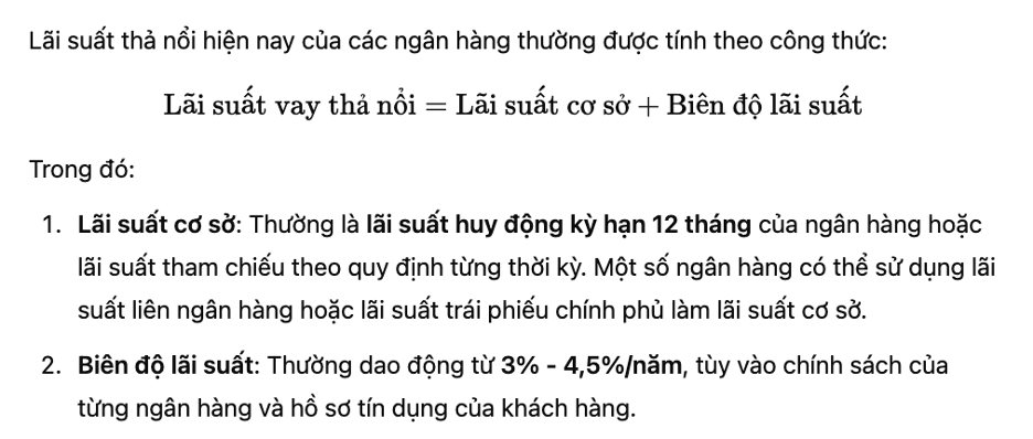 Trong đó, lãi suất cơ sở là lãi suất huy động kỳ hạn 12 tháng của ngân hàng hoặc lãi suất tham chiếu theo từng thời kỳ. Biên độ lãi suất là phần cộng thêm vào lãi suất cơ sở, thường dao động từ 3% - 4,5%, tùy vào chính sách của ngân hàng và hồ sơ tín dụng của khách hàng.