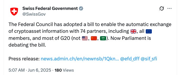 Thụy Sĩ công bố chia sẻ thông tin thuế crypto, Việt Nam trong danh sách đối tác (Nguồn: X)