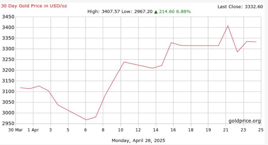 Kể từ ngày 2/4 – khi Tổng thống Trump khởi động lại cuộc chiến thương mại bằng loạt thuế mới – giá vàng đã từ 3.115 USD/ounce vọt lên 3.335 USD/ounce, tức tăng 7% chỉ trong chưa đầy 30 ngày.