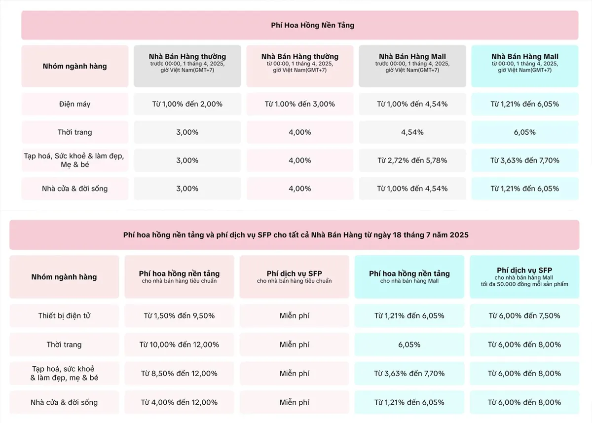 Cụ thể, nhà bán hàng tiêu chuẩn trong ngành hàng thời trang sẽ phải trả mức phí hoa hồng từ 10–12%, thay vì 4% trước đó. Các ngành nhà cửa – đời sống, tạp hóa, sức khỏe – làm đẹp, mẹ và bé cũng ghi nhận mức tăng tương tự, trong đó nhiều sản phẩm áp dụng mức từ 8,5–12%. Đối với nhà bán hàng chính hãng (Mall), mức tăng nhẹ hơn, dao động từ 0,5–2% so với mức cũ.