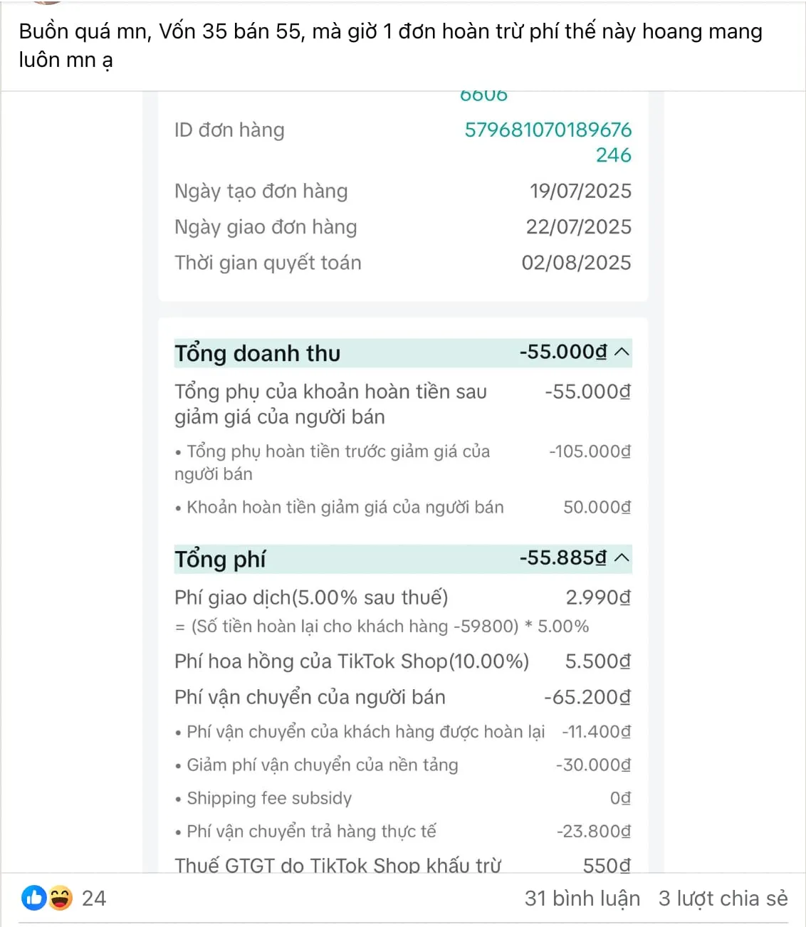 Tình cảnh tương tự cũng xảy ra với anh Việt Dũng (Quận 3, TP. Hồ Chí Minh), người chuyên bán đồ gia dụng trên TikTok. Theo anh, kể từ khi áp dụng chính sách phí mới, bảng sao kê doanh thu ghi nhận mức chiết khấu tăng mạnh dù không có thay đổi về giá bán.