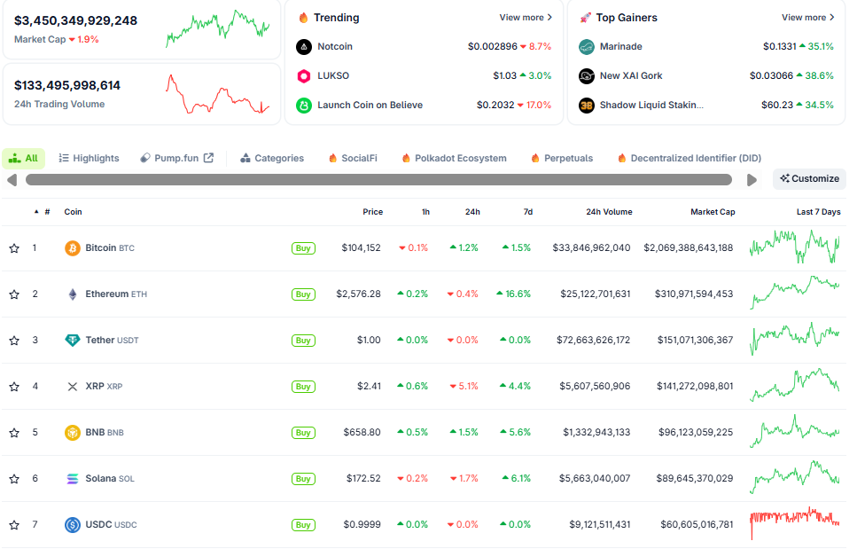Vốn hóa thị trường crypto đạt 3,4 nghìn tỷ USD, giảm 1,9% trong 24h qua. Dù 'đầu tàu" Bitcoin giữ ổn định ở mức 104.000 USD nhưng sắc đỏ bao trùm khắp bảng giá. Chỉ số Tham lam & Sợ hãi tiến lên mức 71 điểm, cho thấy tâm lý 'coin thủ' vẫn tích cực.