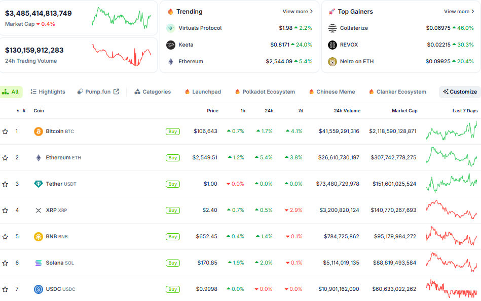 'Đầu tàu' Bitcoin tiếp tục vượt mốc 106.000 USD, kéo toàn bộ thị trường bật tăng trở lại. Vốn hóa thị trường đạt mốc 3,4 nghìn tỷ USD, tăng nhẹ so với ngày hôm qua.
