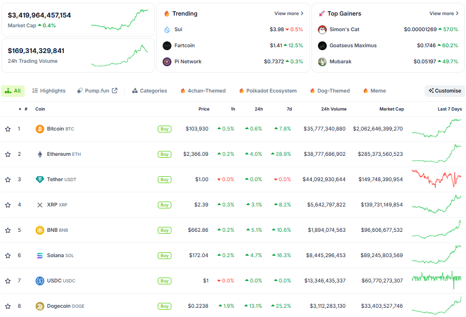 Bitcoin (BTC): Đàu tàu Bitcoin vẫn duy trì đà tăng trong 24 giờ, hiện đồng vàng số đang được giao dịch quanh mốc 104.000 USD - tương ứng tăng 40% so với đáy đầu tháng 4.
