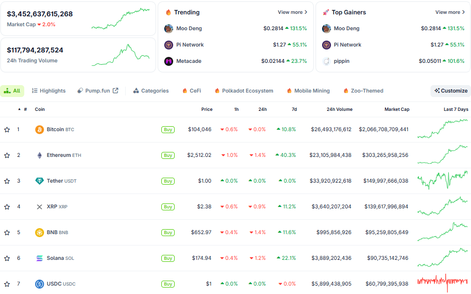 Thị trường crypto giữ vững nhịp tăng, vốn hóa thị trường đạt mốc 3,4 nghìn tỷ USD. Trong đó, Bitcoin giao dịch ổn định quanh mốc 104.000 USD, các memecoin như PNUT, NEIRO bất ngờ bứt phá. Chỉ số Tham lam & Sợ hãi tiến sâu vào vùng tham lam - 73 điểm.