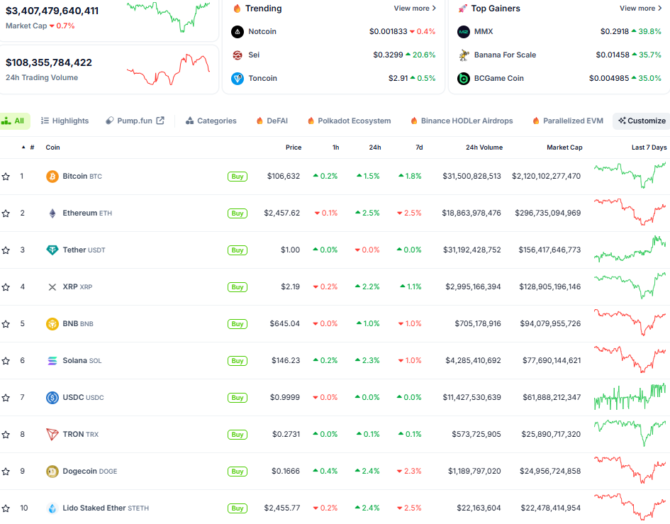 Bitcoin (BTC): Bitcoin tiếp tục neo ở mốc 106.000 USD trong bối cảnh bất ổn địa chính trị dần lắng xuống. Chủ tịch Cục Dự trữ liên bang Mỹ (Fed) Jerome Powell đã có phiên điều trần trước Hạ viện Mỹ, ông giải thích lý do chưa hạ lãi suất là vì dự báo rằng lạm phát sẽ tăng đáng kể trong năm nay.