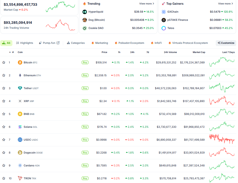 Bitcoin (BTC): 'Vàng số' giao dịch quanh mốc 109.000 USD - tăng gần 2% trong 24 giờ qua. Tỷ lệ thống trị thị trường Bitcoin Dom đạt 63,3% cho thấy dòng vốn vẫn tập trung vào đồng tiền mã hóa số 1 thị trường này.