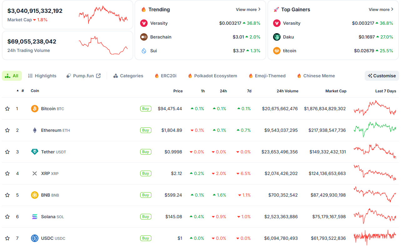 Các đồng altcoin hàng đầu như Ethereum (ETH), Binance Coin (BNB) và Solana (SOL) ghi nhận mức tăng nhẹ trong 24 giờ qua: