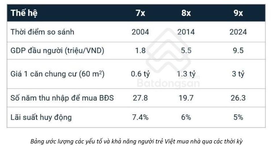 Thời điểm năm 2004, một cá nhân thuộc thế hệ 7x mất khoảng 31,3 năm thu nhập để mua được một căn chung cư (60 m2) giá 0,6 tỷ đồng, trong điều kiện lãi suất huy động là 7,4%. Sau 10 năm, số năm thu nhập để một cá nhân thuộc thế hệ 8x mua được căn hộ như trên là 22,7 năm. Giá căn hộ đã tăng lên 1,5 tỷ đồng trong khi lãi suất huy động giảm còn 6%.