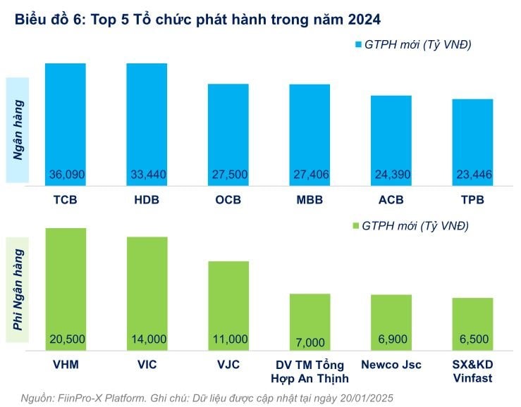 Về lượng phát hành mới, năm 2024, quy mô phát hành mới đạt 473,6 nghìn tỷ đồng, tăng mạnh 35,2% so với năm 2023, chủ yếu do ngành Ngân hàng đẩy mạnh phát hành riêng lẻ. Trong khi đó, phát hành mới tiếp tục kém tích cực ở nhóm Phi ngân hàng, chỉ tăng 3,1%.